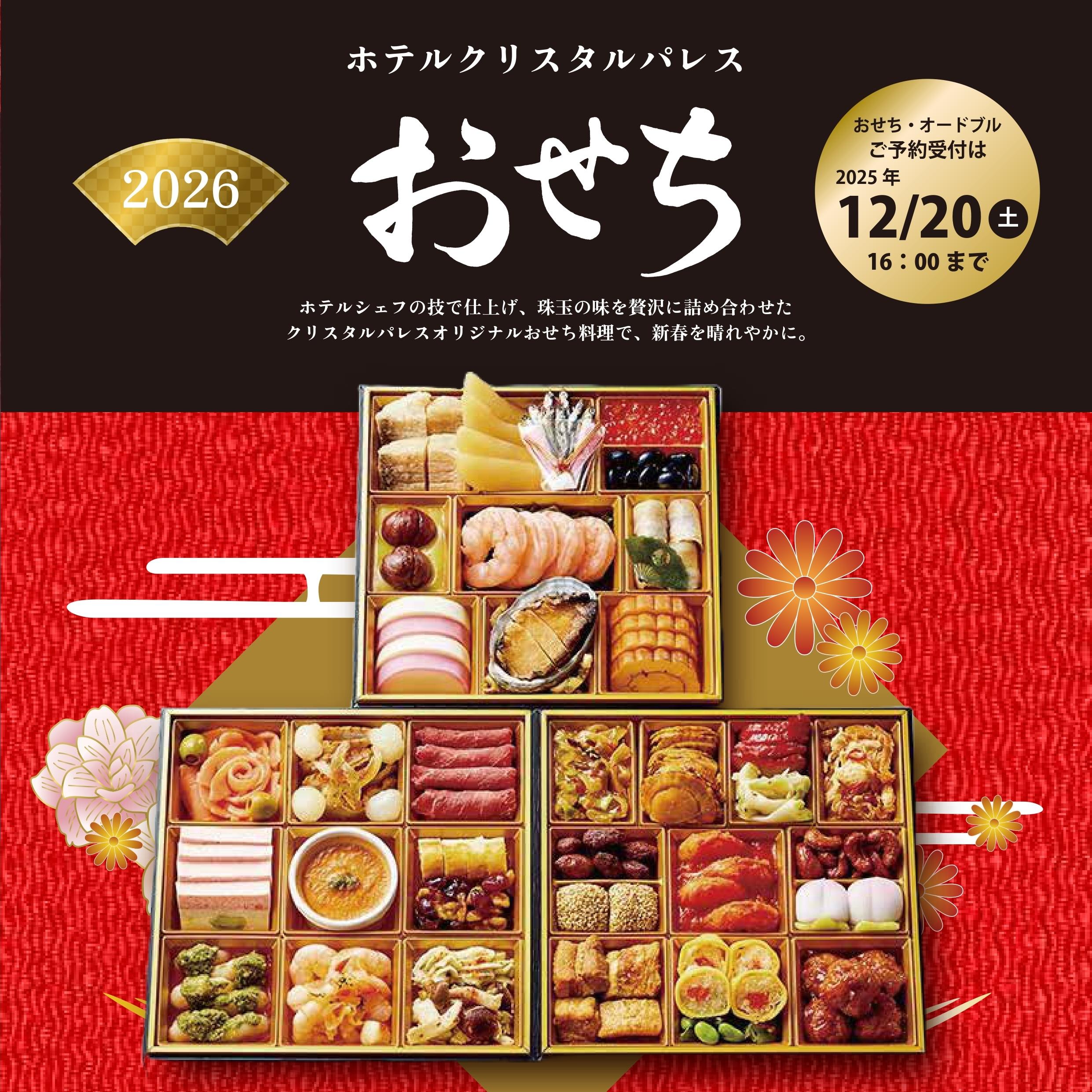 ホテルクリスタルパレス《2026おせち》では、当グループ総料理長が監修する