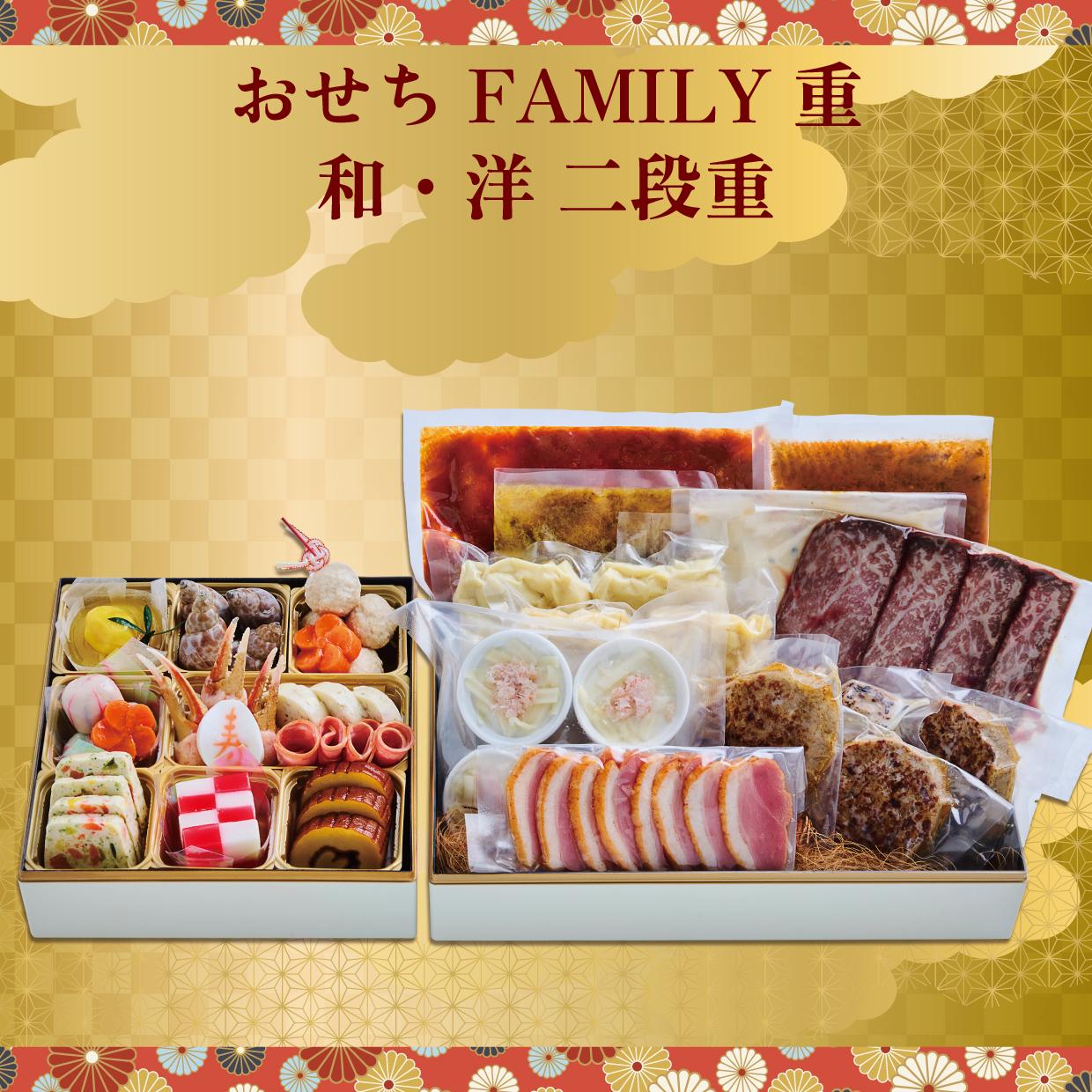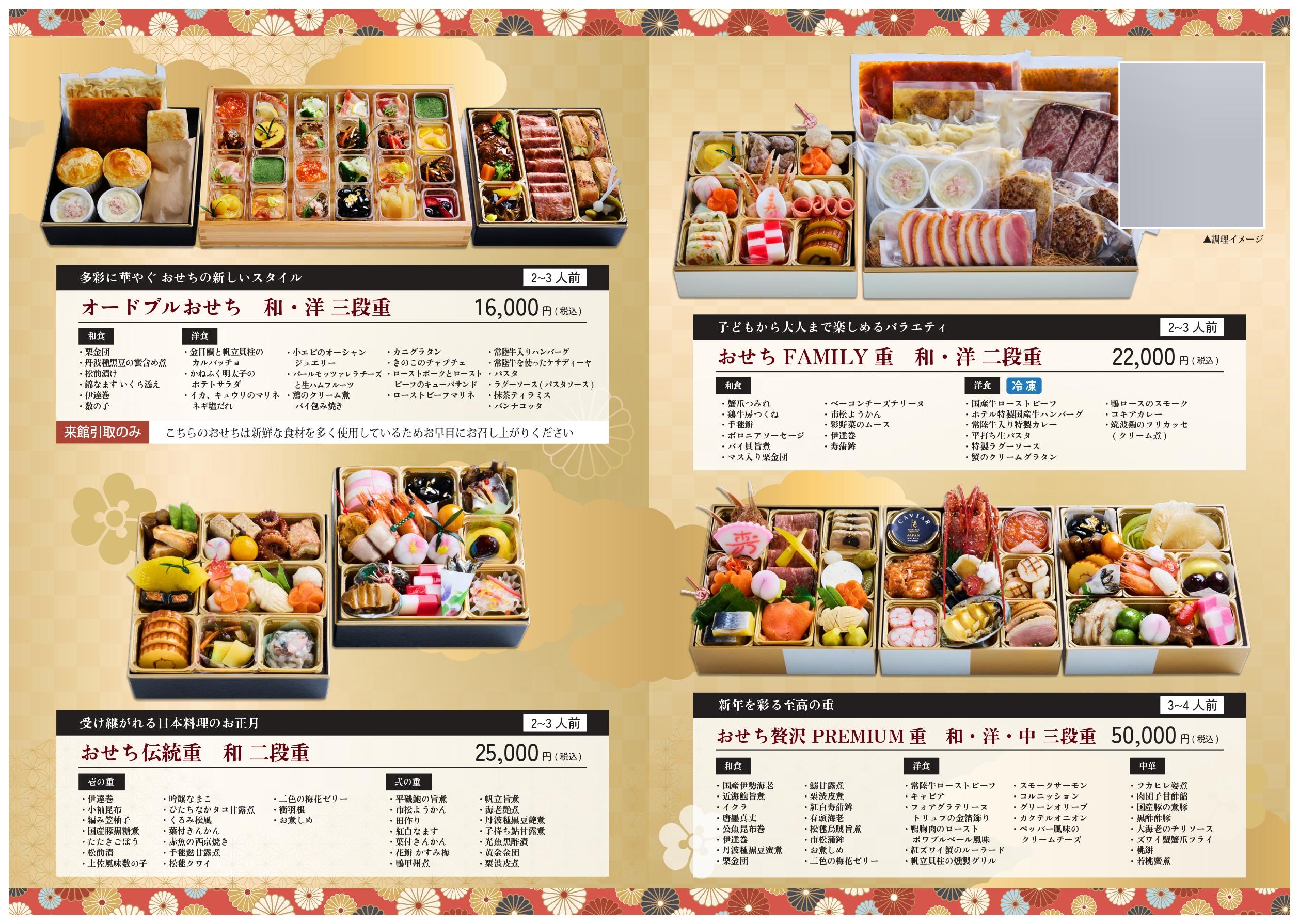 国産伊勢海老・近海鮑旨煮・イクラ・唐墨真丈・公魚昆布巻・伊達巻・丹波種黒豆蜜煮・栗金団・鰯甘露煮・栗渋皮煮・紅白寿蒲鉾・有頭海老・松毬烏賊旨煮・市松蒲鉾・お煮しめ・二色の梅花ゼリー